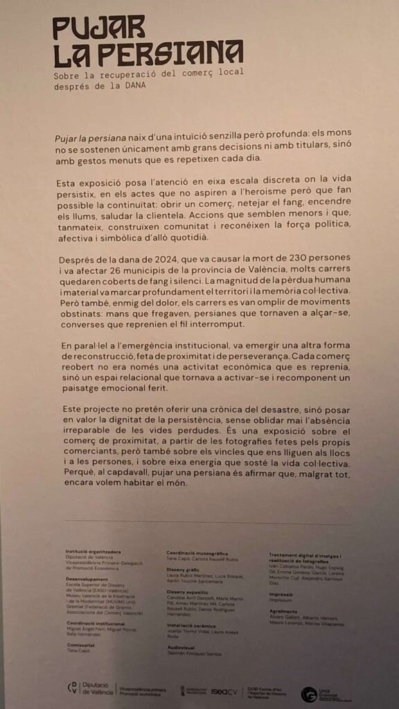 La exposición “Pujar la persiana” se presenta como un homenaje a todos aquellos comercios que, tras la devastación provocada por la DANA, decidieron volver a abrir sus puertas. A través de una serie de fotografías y testimonios, la muestra refleja la realidad que vivieron cientos de pequeños negocios: persianas levantándose de nuevo incluso cuando detrás apenas quedaba nada. Ese gesto, aparentemente cotidiano, se convirtió en un símbolo de resistencia, dignidad y continuidad para el comercio de barrio.